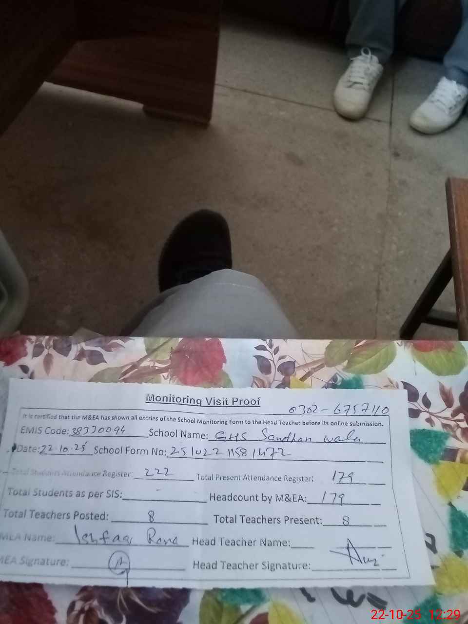 | Name: Me**** Hu**** Designation: (School Headmaster's/Headmistress's) SSE Phone/Cell Number: 03**** |