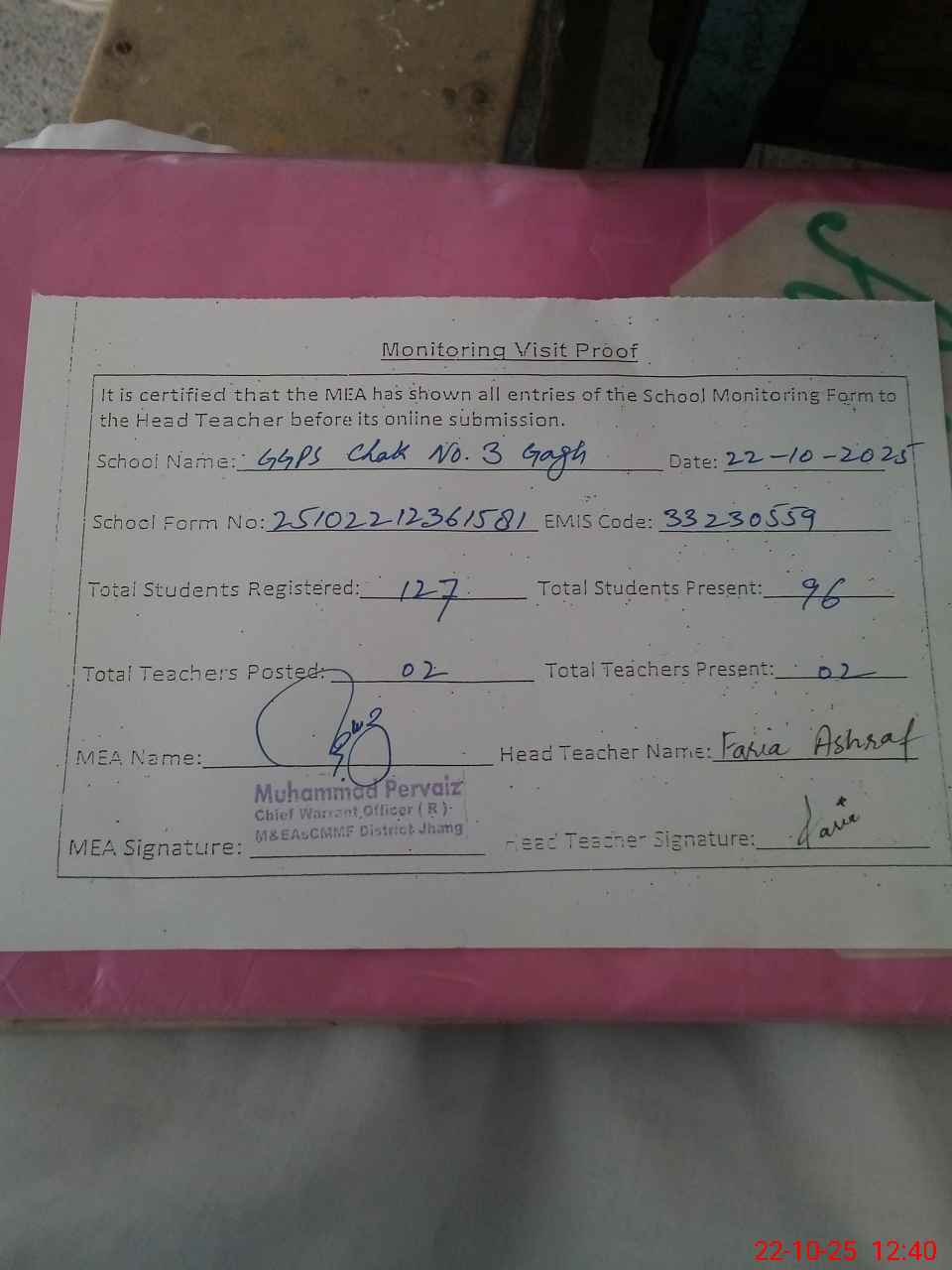 | EMIS Code: 33230559 | Name of School: GGPS CHAK NO 3 GHAGH | |||