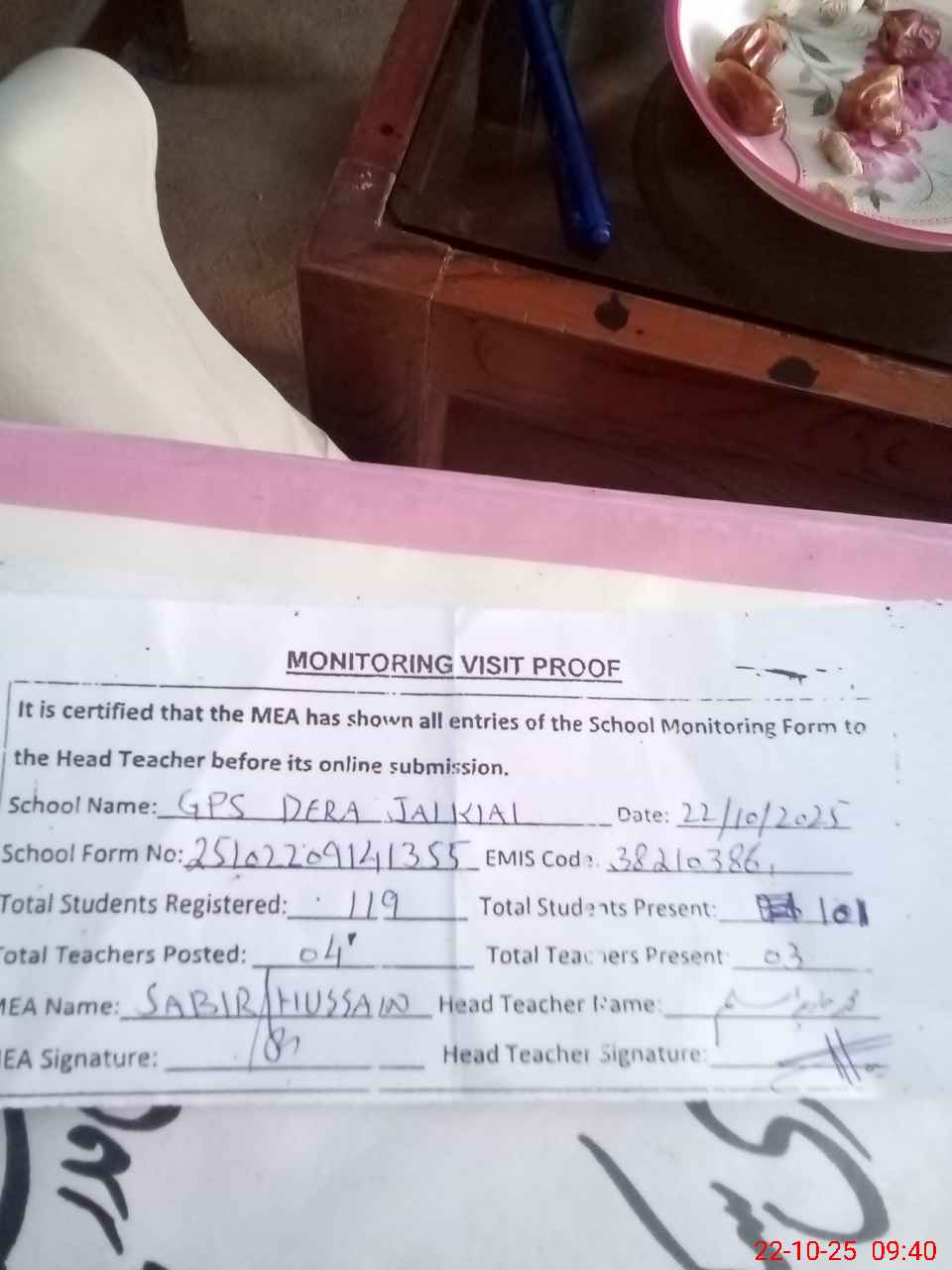 | Attendance Register | Head Teacher | MEA with School | Visit Proof |