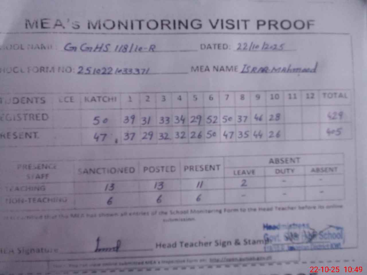 | Attendance Register | Head Teacher | MEA with School | Visit Proof |