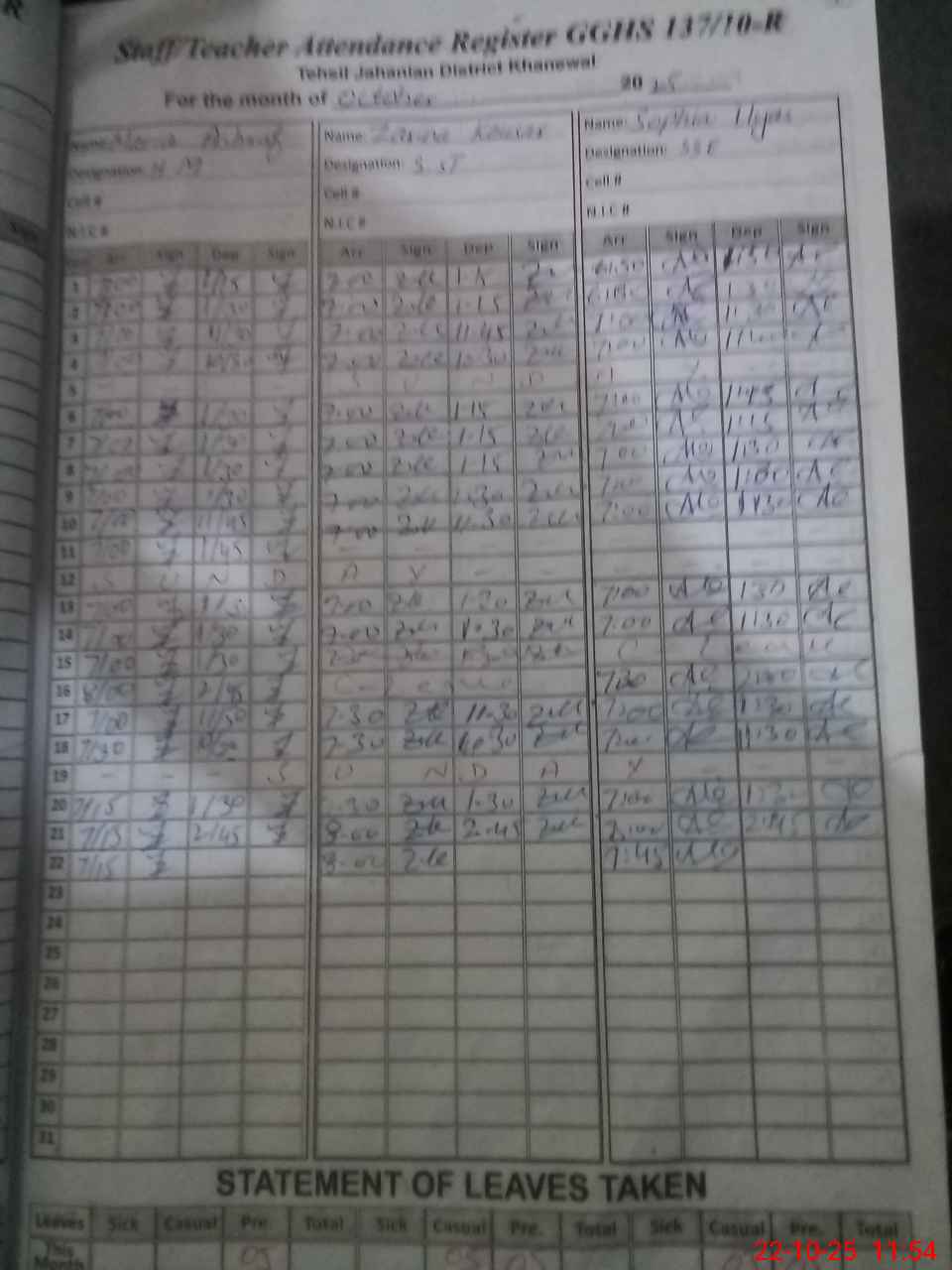 | CNIC | Full Name | Designation | R/C | Absence During Last Calender Month |