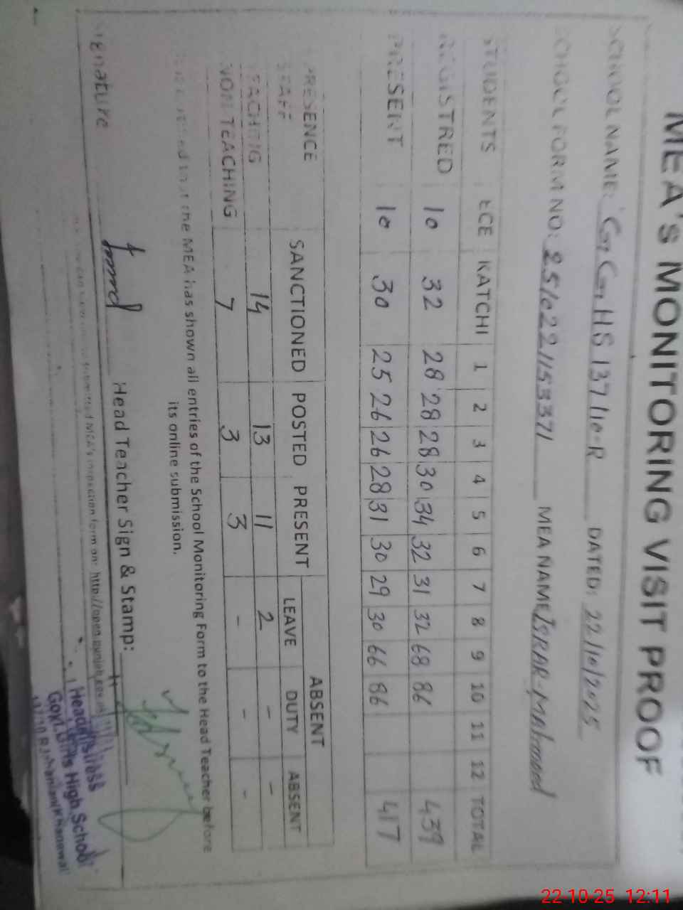 | Attendance Register | Head Teacher | MEA with School | Visit Proof |