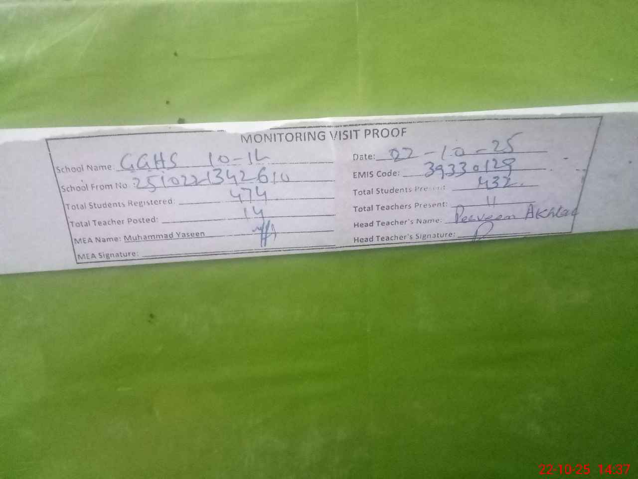 | Attendance Register | Head Teacher | MEA with School | Visit Proof |