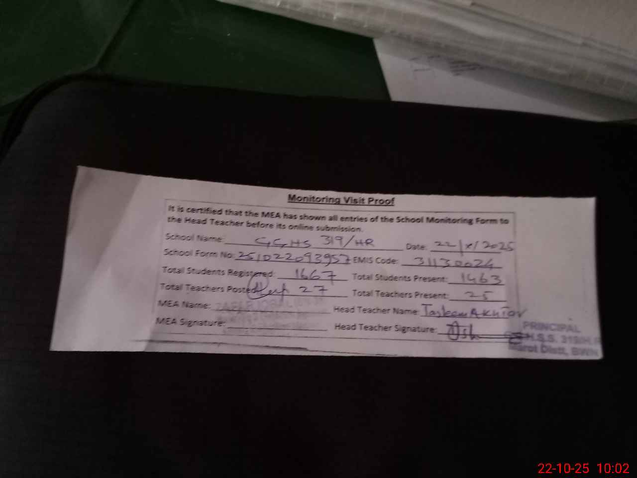 | EMIS Code: 31130024 | Name of School: GGHSS CHAK NO 319 HR | |||