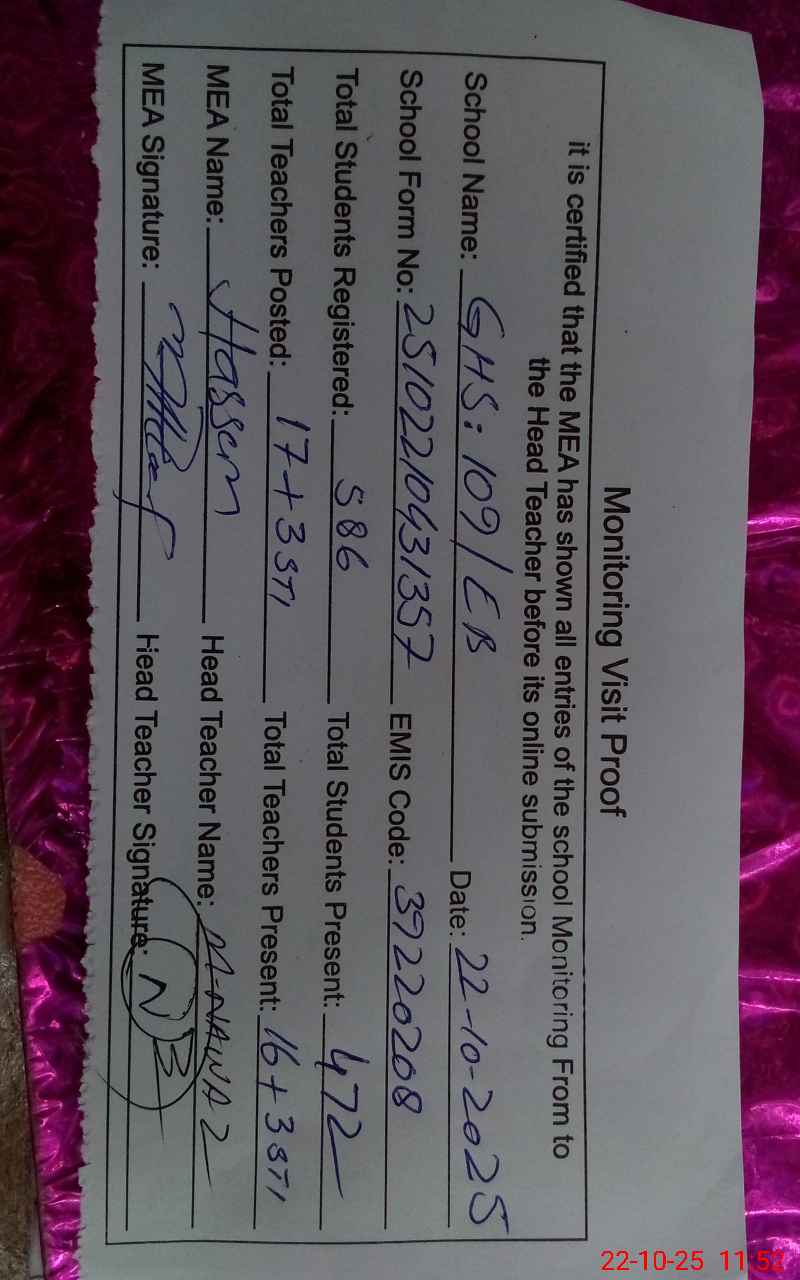 | EMIS Code: 39220208 | Name of School: GHS CHAK NO. 109/ EB | |||