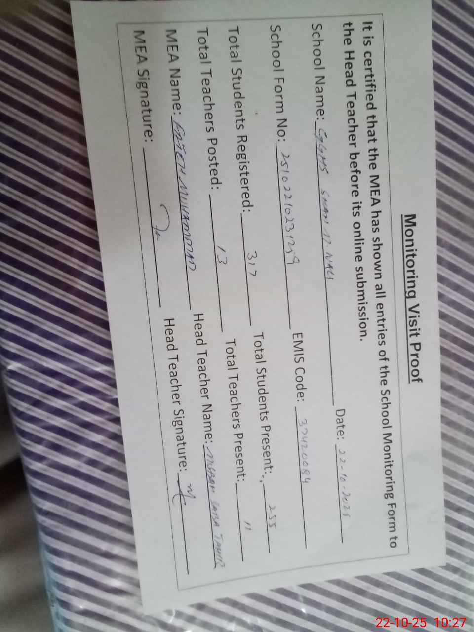 | Certified that this School was Inspected by the Undersigned MEA/DMO Today and the Information Stated Above is as Per Record. | |||||