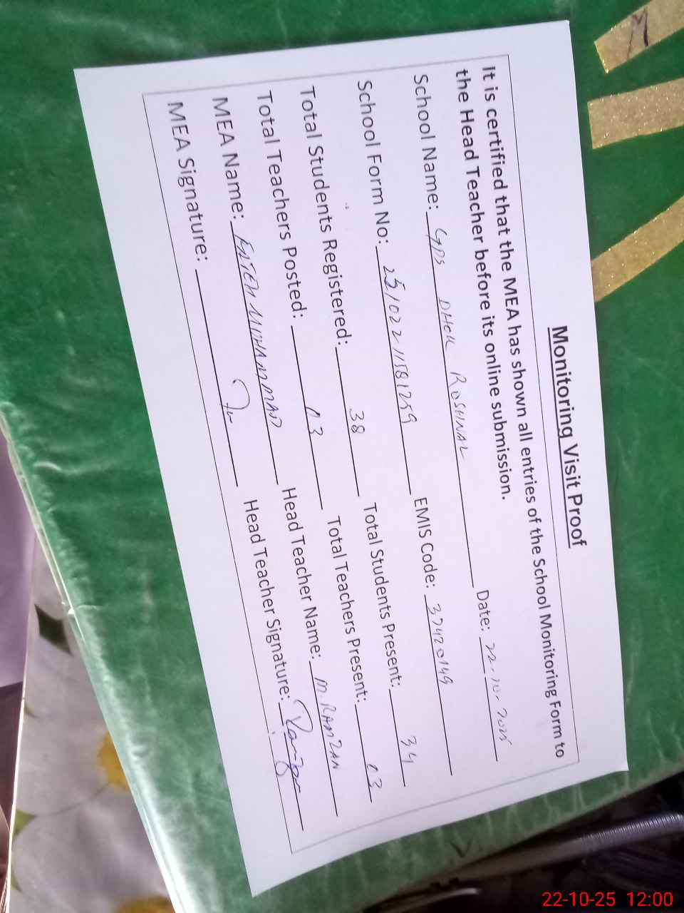 | Attendance Register | Head Teacher | MEA with School | Visit Proof |