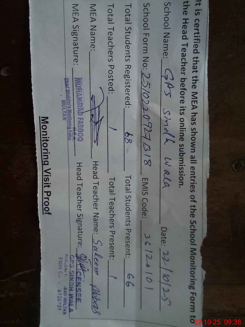 | EMIS Code: 36120101 | Name of School: GPS SINDH WALA MOZA PUNJANI P/O LASURI | |||
