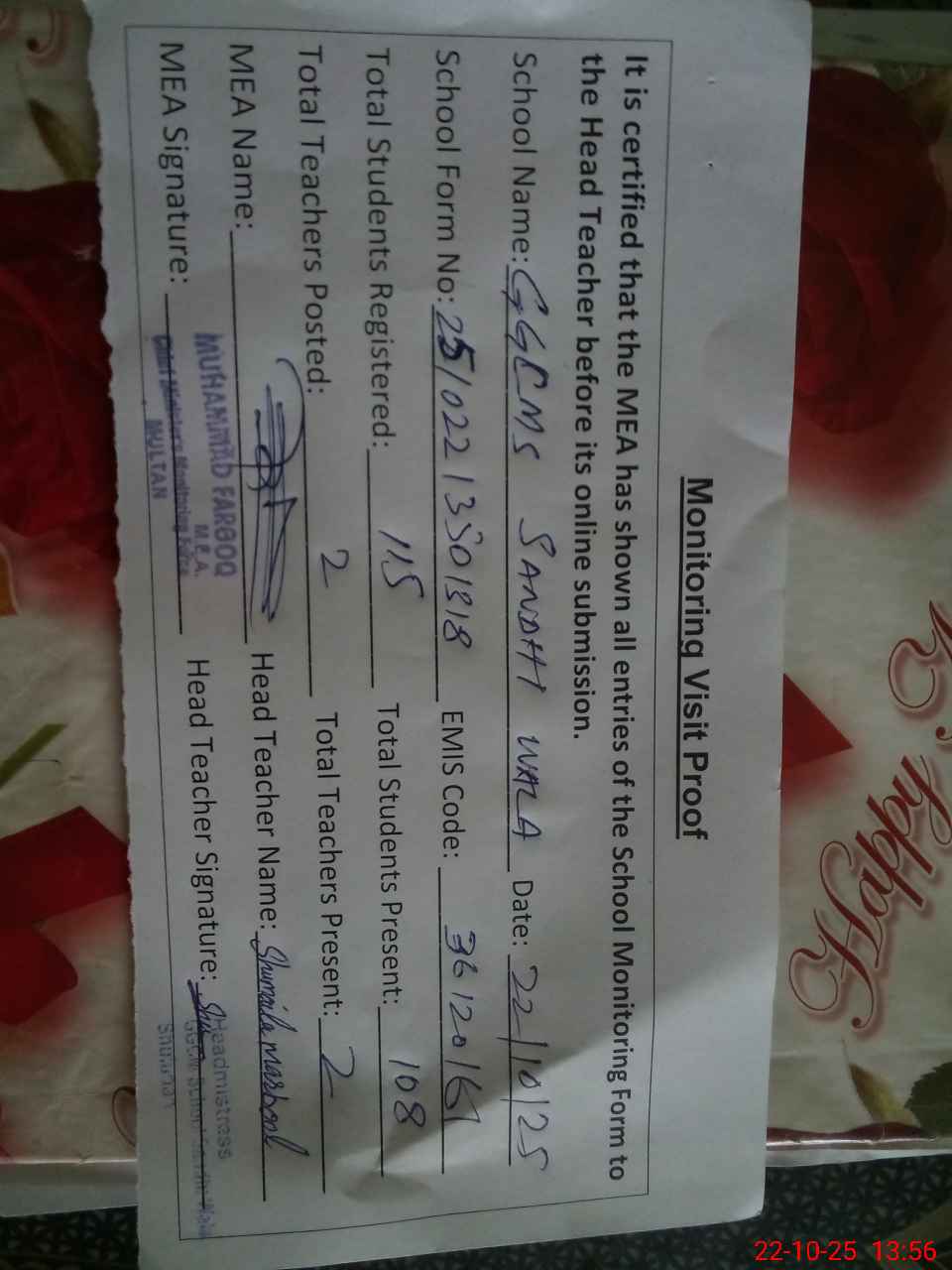 | Certified that this School was Inspected by the Undersigned MEA/DMO Today and the Information Stated Above is as Per Record. | |||||