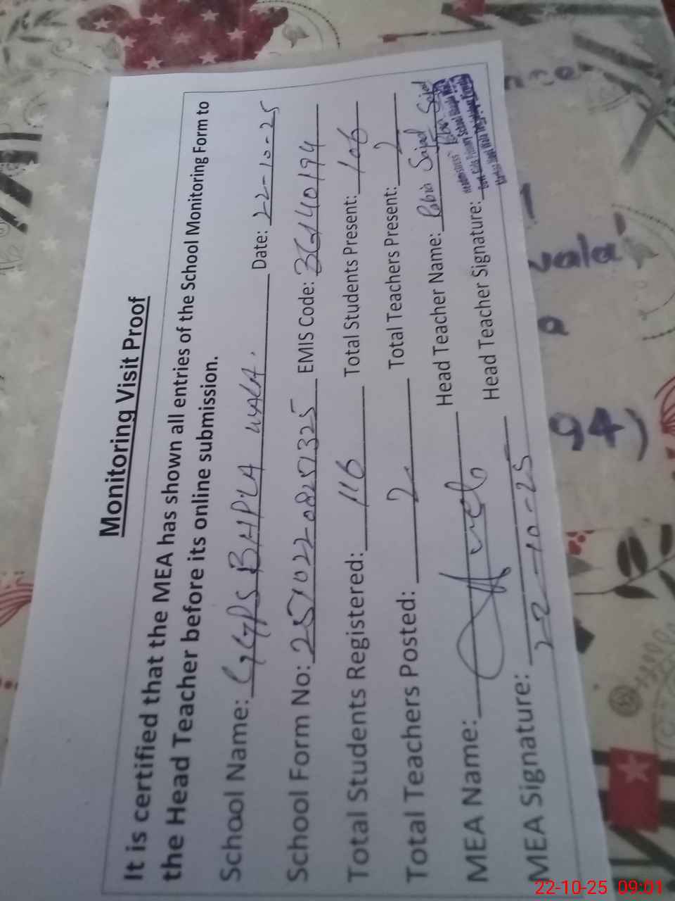 | Attendance Register | Head Teacher | MEA with School | Visit Proof |