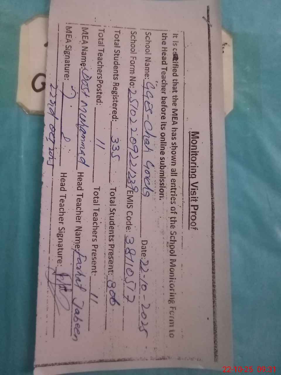| Attendance Register | Head Teacher | MEA with School | Visit Proof |