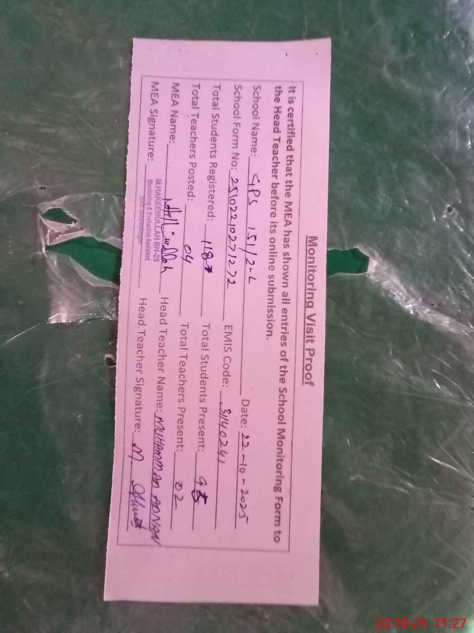 | Attendance Register | Head Teacher | MEA with School | Visit Proof |