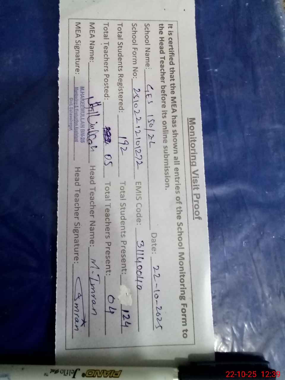 | Attendance Register | Head Teacher | MEA with School | Visit Proof |