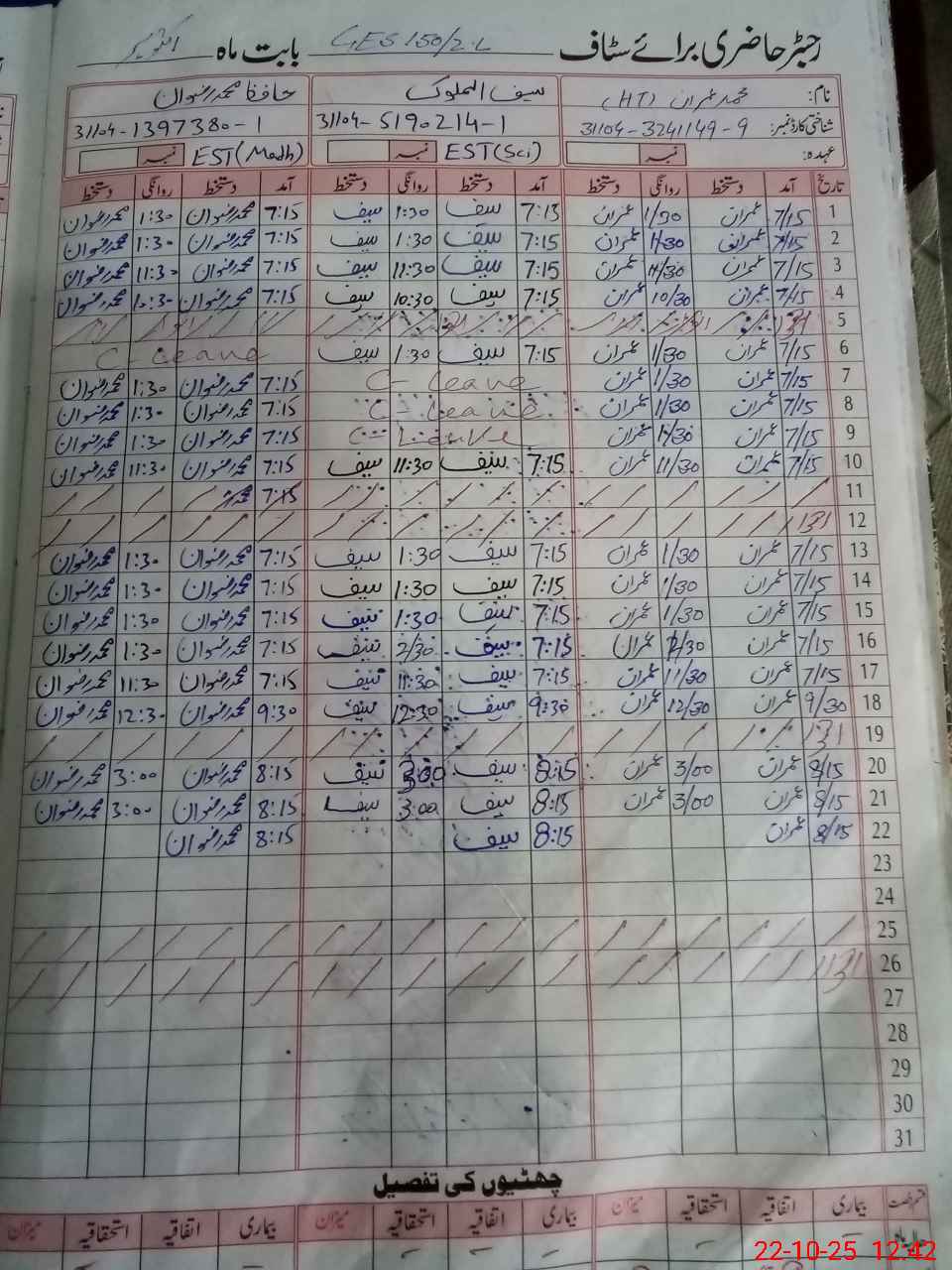 | CNIC | Full Name | Designation | R/C | Absence During Last Calender Month |