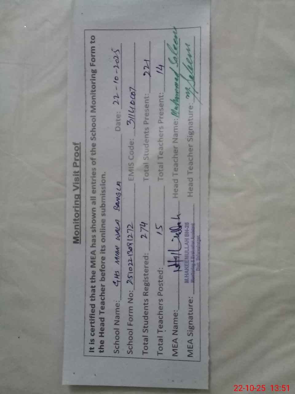 | Certified that this School was Inspected by the Undersigned MEA/DMO Today and the Information Stated Above is as Per Record. | |||||