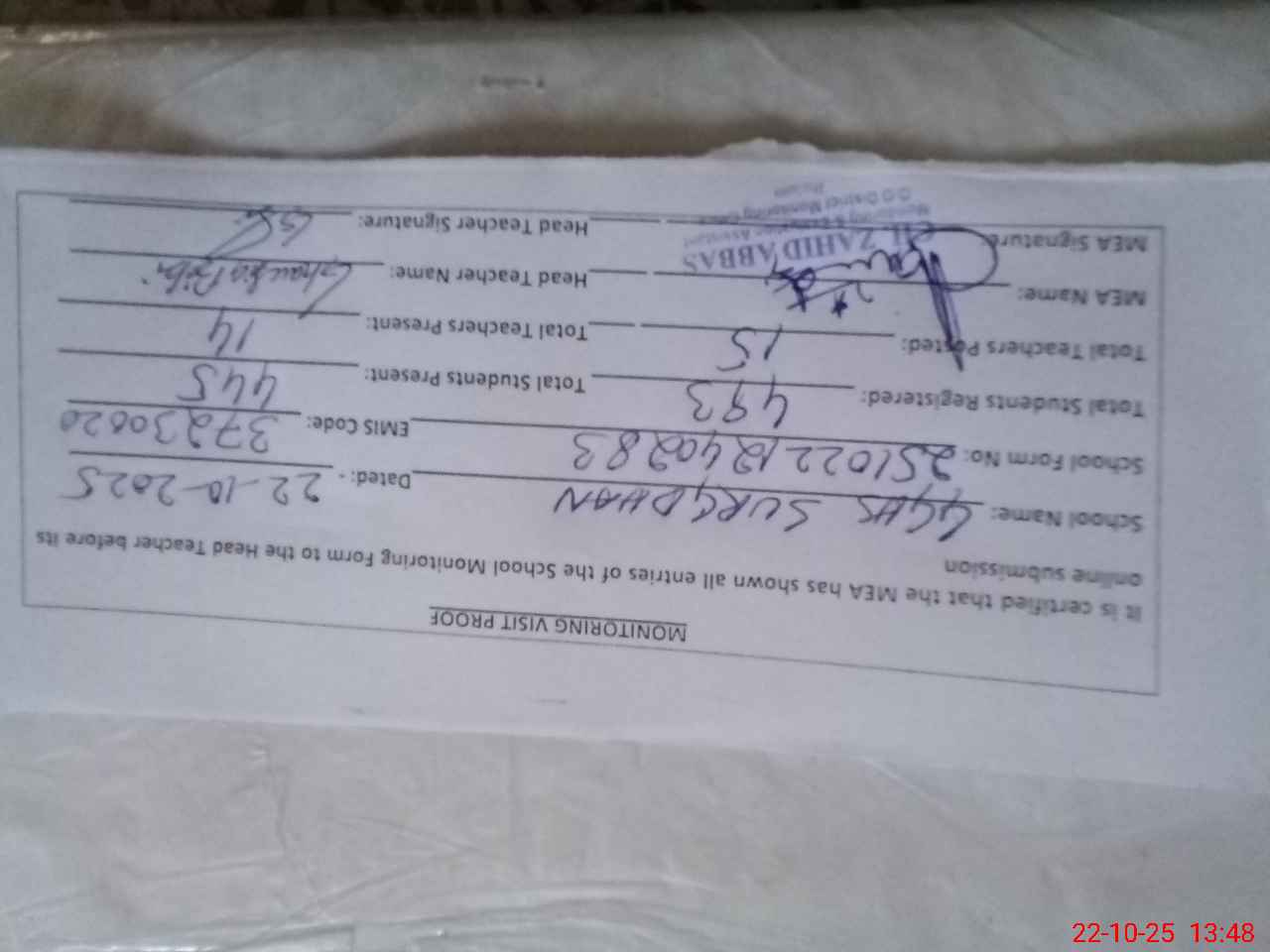 | Monitoring Date: 22-10-2025 | Start Time: 22-10-2025 12:40 PM | End Time: 22-10-2025 01:54 PM | Name of MEA: Za**** Ab**** | |