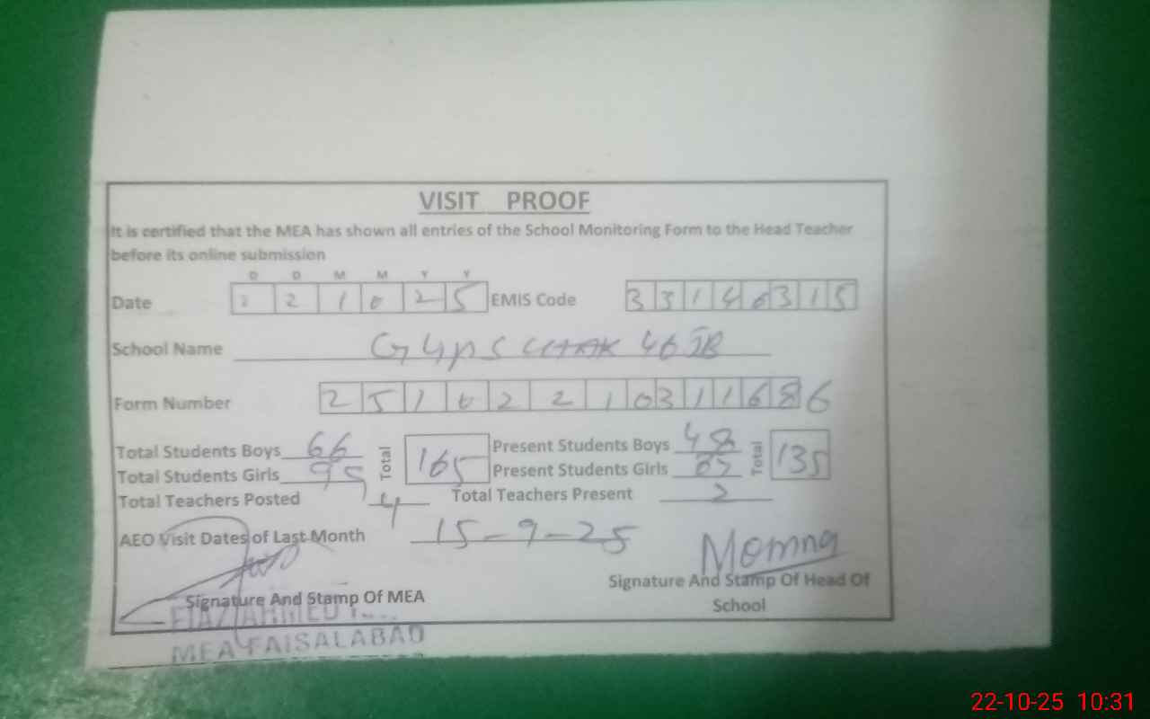 | EMIS Code: 33140315 | Name of School: GGES CHAK 46 JB | |||