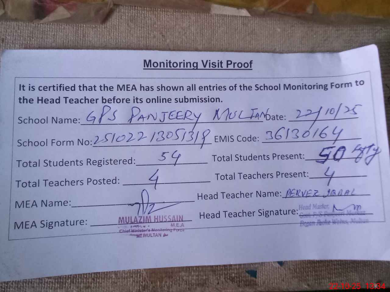 | Attendance Register | Head Teacher | MEA with School | Visit Proof |