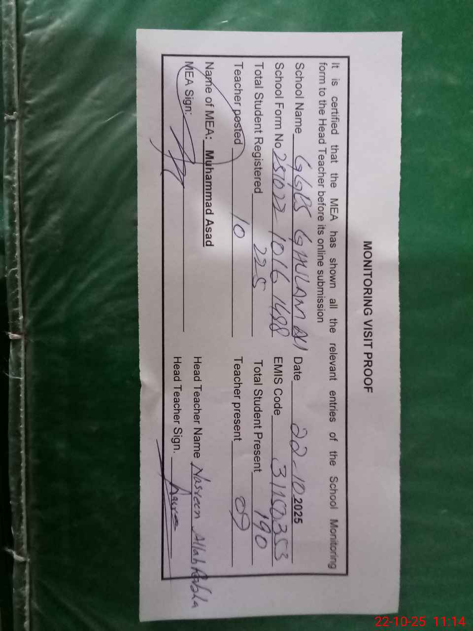| Attendance Register | Head Teacher | MEA with School | Visit Proof |