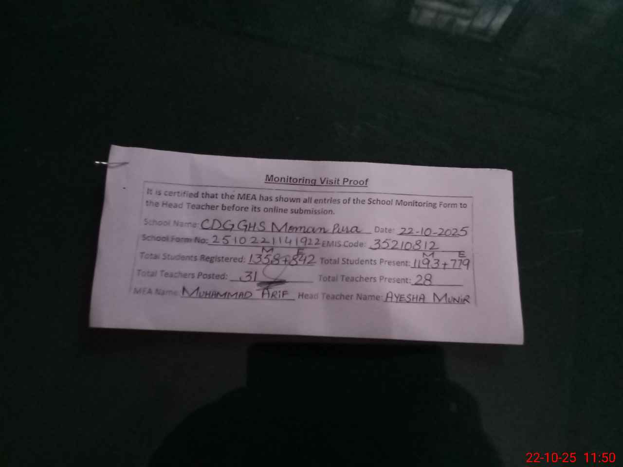 | Attendance Register | Head Teacher | MEA with School | Visit Proof |