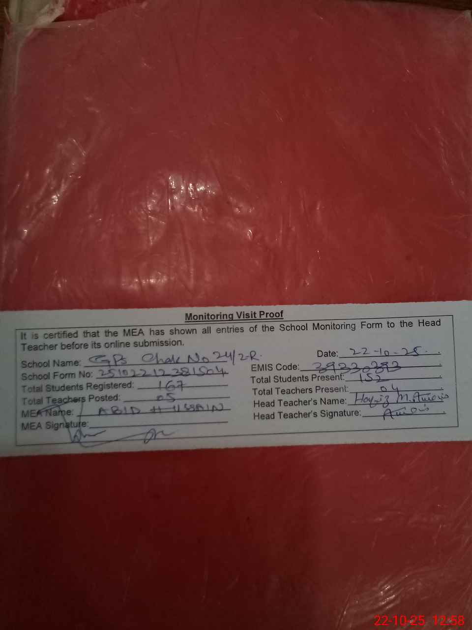 | Attendance Register | Head Teacher | MEA with School | Visit Proof |