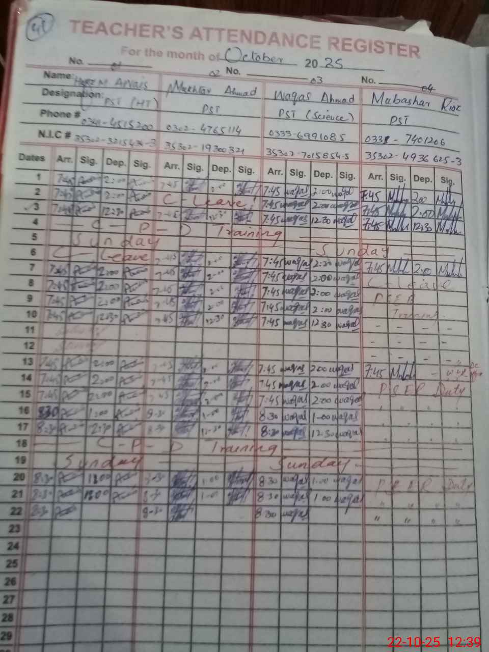| CNIC | Full Name | Designation | R/C | Absence during last cal. month |