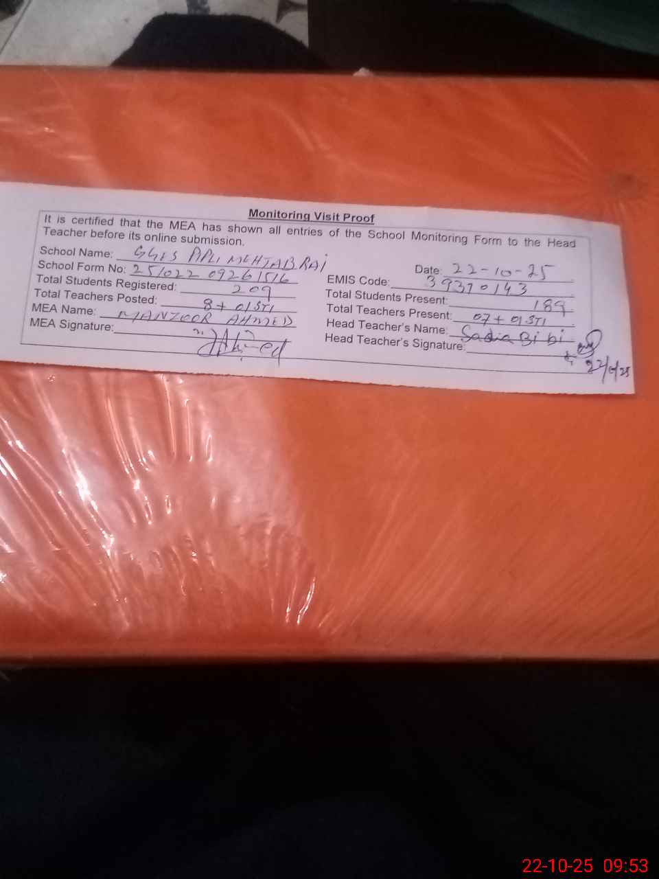 | Monitoring Date: 22-10-2025 | Start Time: 22-10-2025 09:26 AM | End Time: 22-10-2025 09:53 AM | Name of MEA: MA**** AH**** | |