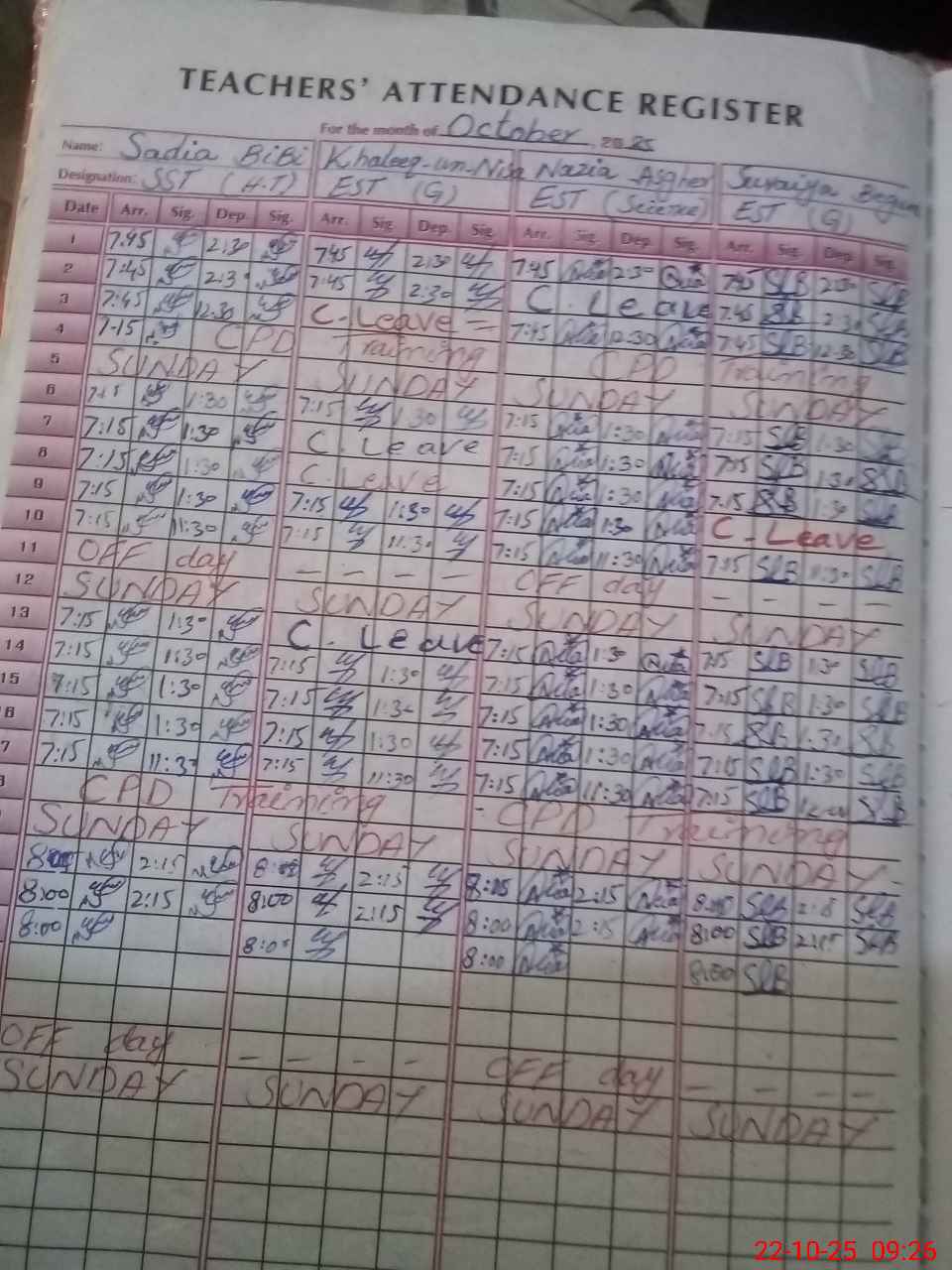 | CNIC | Full Name | Designation | R/C | Absence during last cal. month |