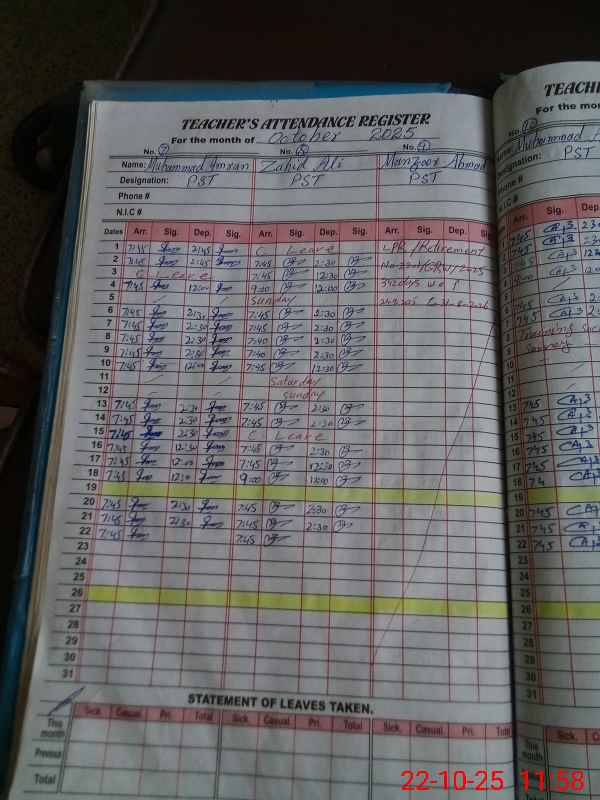 | CNIC | Full Name | Designation | R/C | Absence During Last Calender Month |