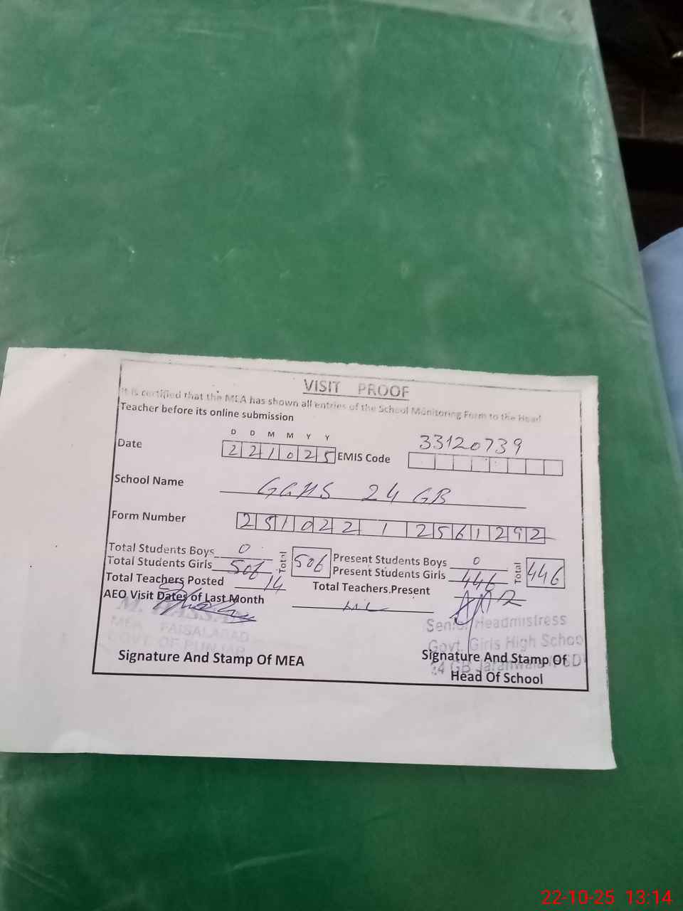 | EMIS Code: 33120739 | Name of School: GGHS CHAK 24 GB | |||
