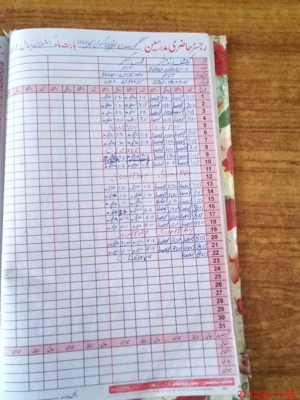 | CNIC | Full Name | Designation | R/C | Absence During Last Calender Month |
