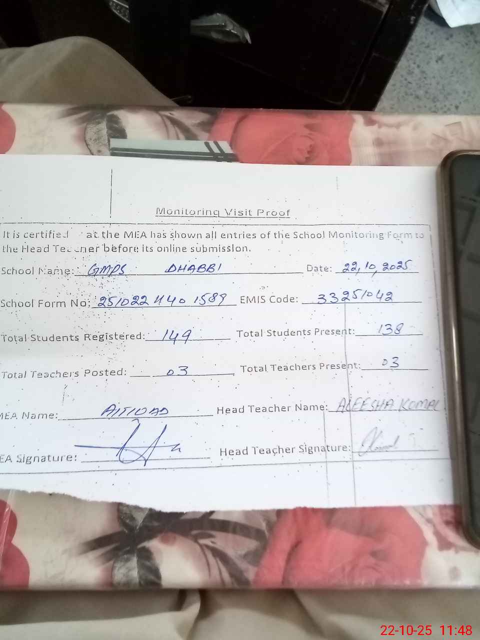 | EMIS Code: 33251042 | Name of School: GMPS DHABBI | |||