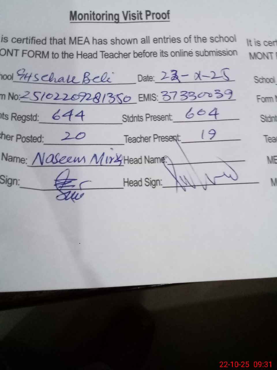 | Monitoring Date: 22-10-2025 | Start Time: 22-10-2025 09:00 AM | End Time: 22-10-2025 09:32 AM | Name of MEA: Na**** Sh**** | |