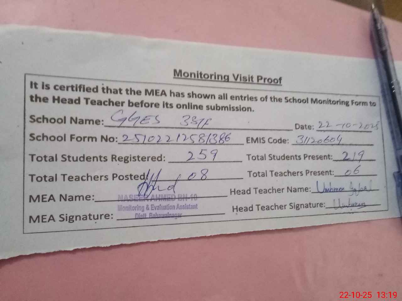 | EMIS Code: 31120604 | Name of School: GGES CHAK NO. 33/F | |||