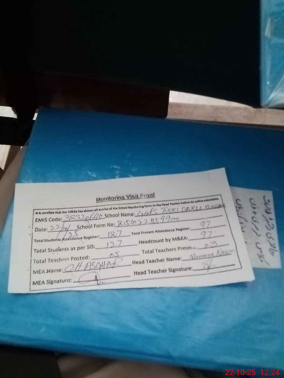 | Attendance Register | Head Teacher | MEA with School | Visit Proof |