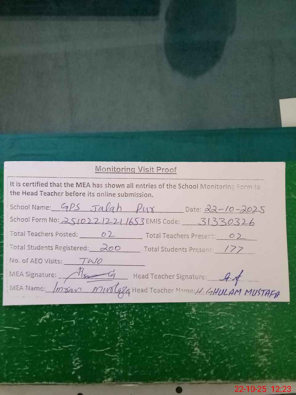 | Attendance Register | Head Teacher | MEA with School | Visit Proof |