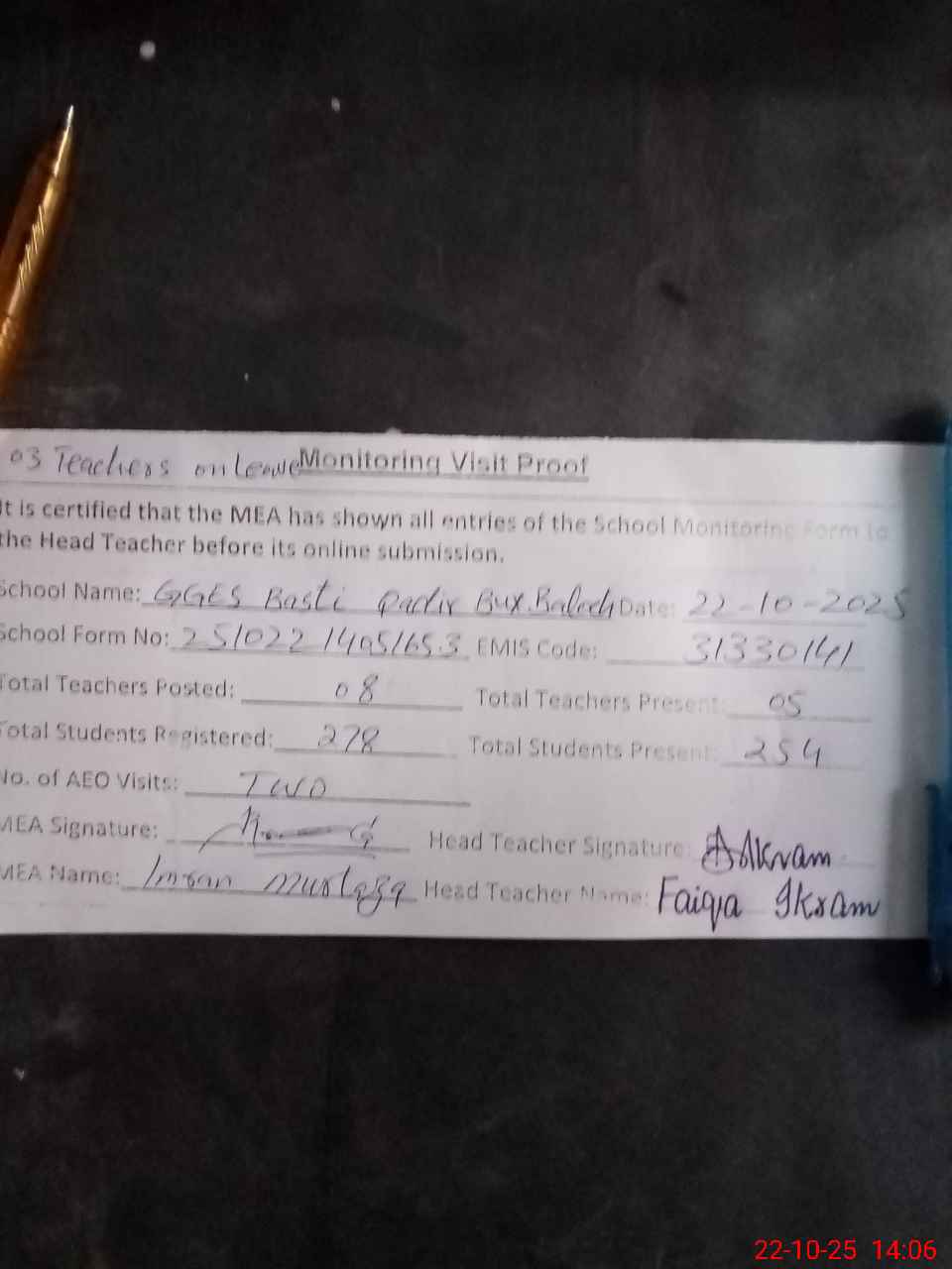 | Attendance Register | Head Teacher | MEA with School | Visit Proof |
