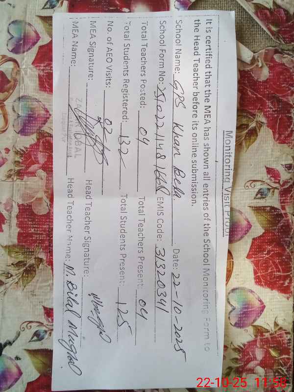 | EMIS Code: 31320341 | Name of School: GPS KHAN BELLA | |||