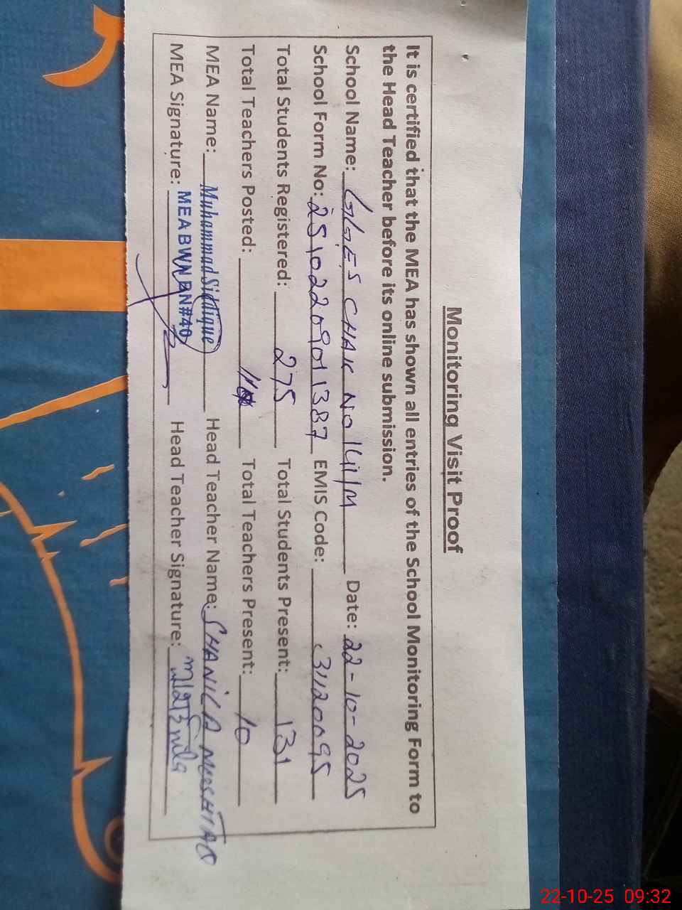 | Certified that this School was Inspected by the Undersigned MEA/DMO Today and the Information Stated Above is as Per Record. | |||||