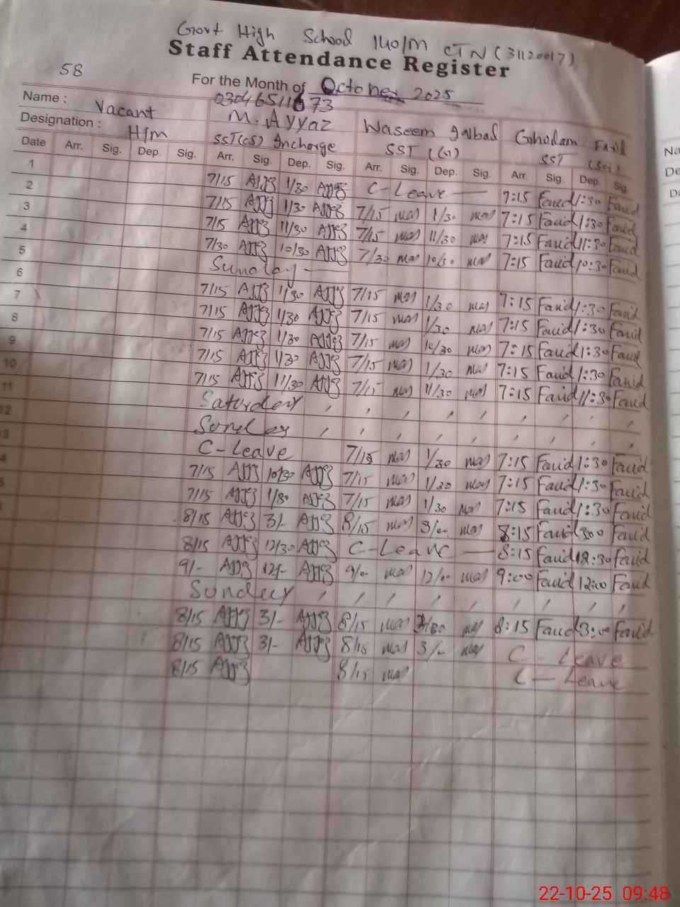 | Name: Mu**** Ay**** Designation: (School Headmaster's/Headmistress's) SST CS Phone/Cell Number: 03**** |