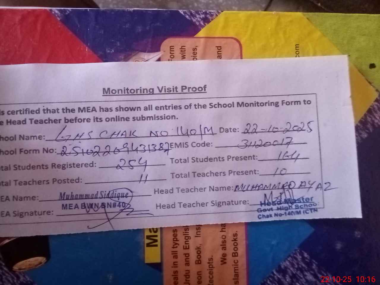 | Attendance Register | Head Teacher | MEA with School | Visit Proof |