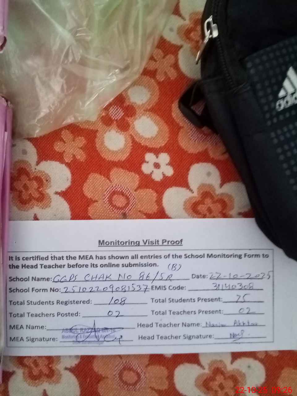 | Attendance Register | Head Teacher | MEA with School | Visit Proof |
