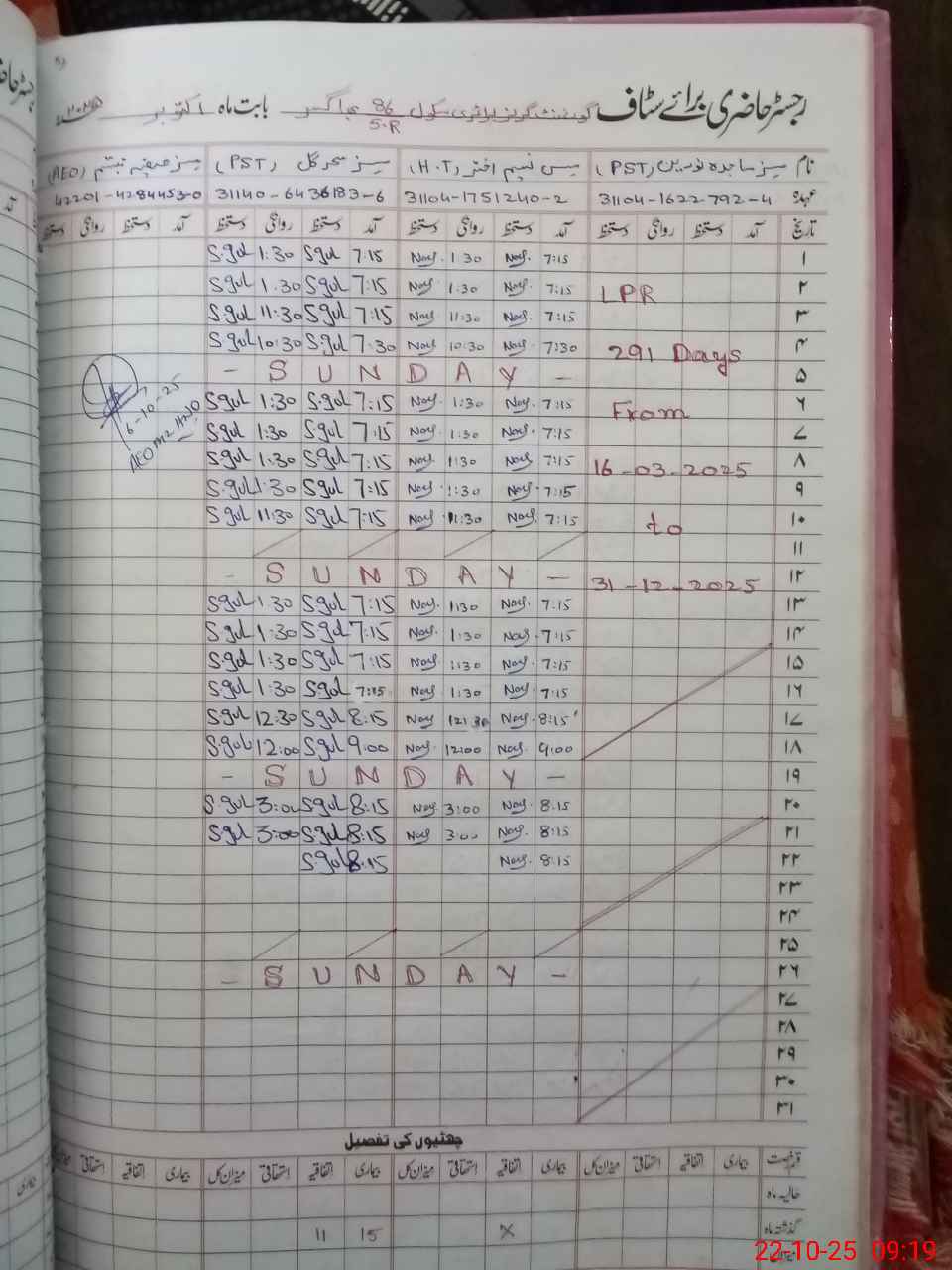 | CNIC | Full Name | Designation | R/C | Absence during last cal. month |