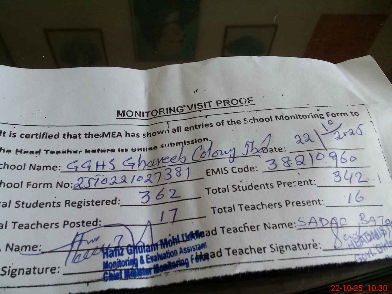 | Monitoring Date: 22-10-2025 | Start Time: 22-10-2025 10:05 AM | End Time: 22-10-2025 10:34 AM | Name of MEA: HA**** GH**** MO**** UDDI**** | |