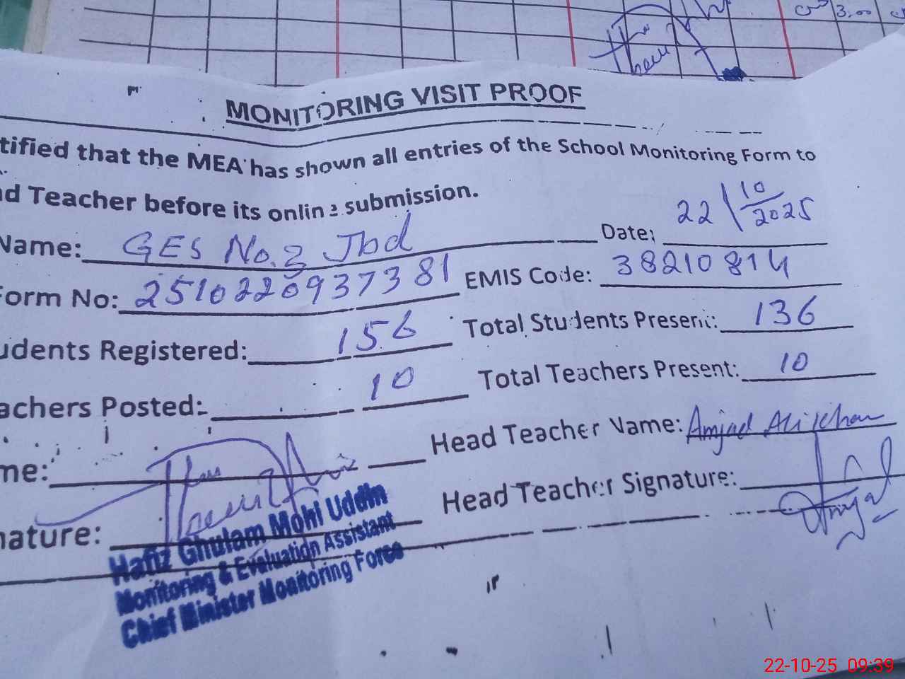 | Monitoring Date: 22-10-2025 | Start Time: 22-10-2025 09:18 AM | End Time: 22-10-2025 09:57 AM | Name of MEA: HA**** GH**** MO**** UDDI**** | |