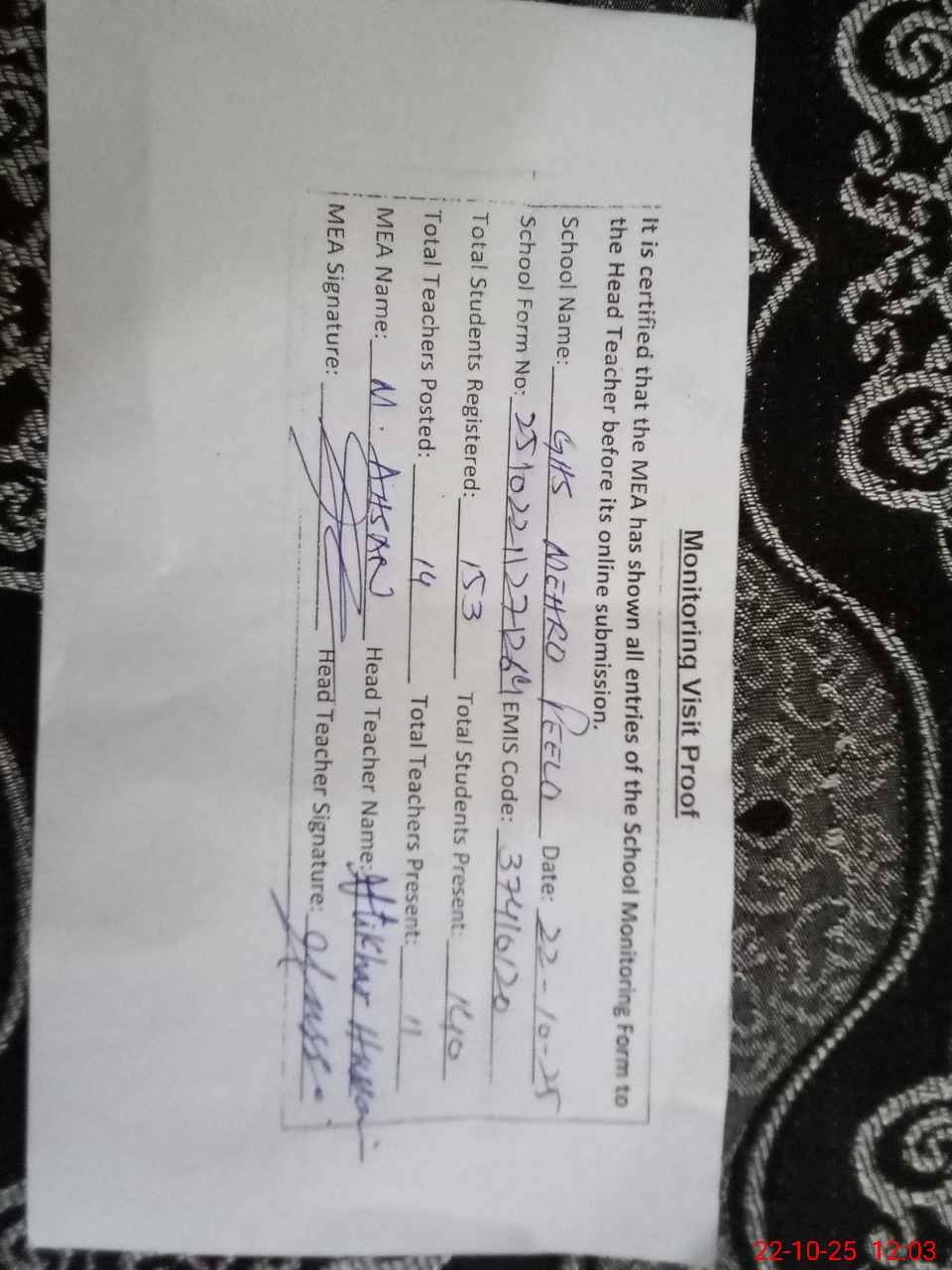 | EMIS Code: 37410120 | Name of School: GHS MEHRO PEELO | |||