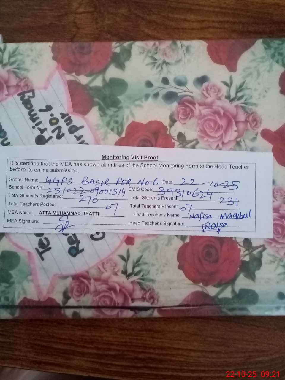 | Attendance Register | Head Teacher | MEA with School | Visit Proof |