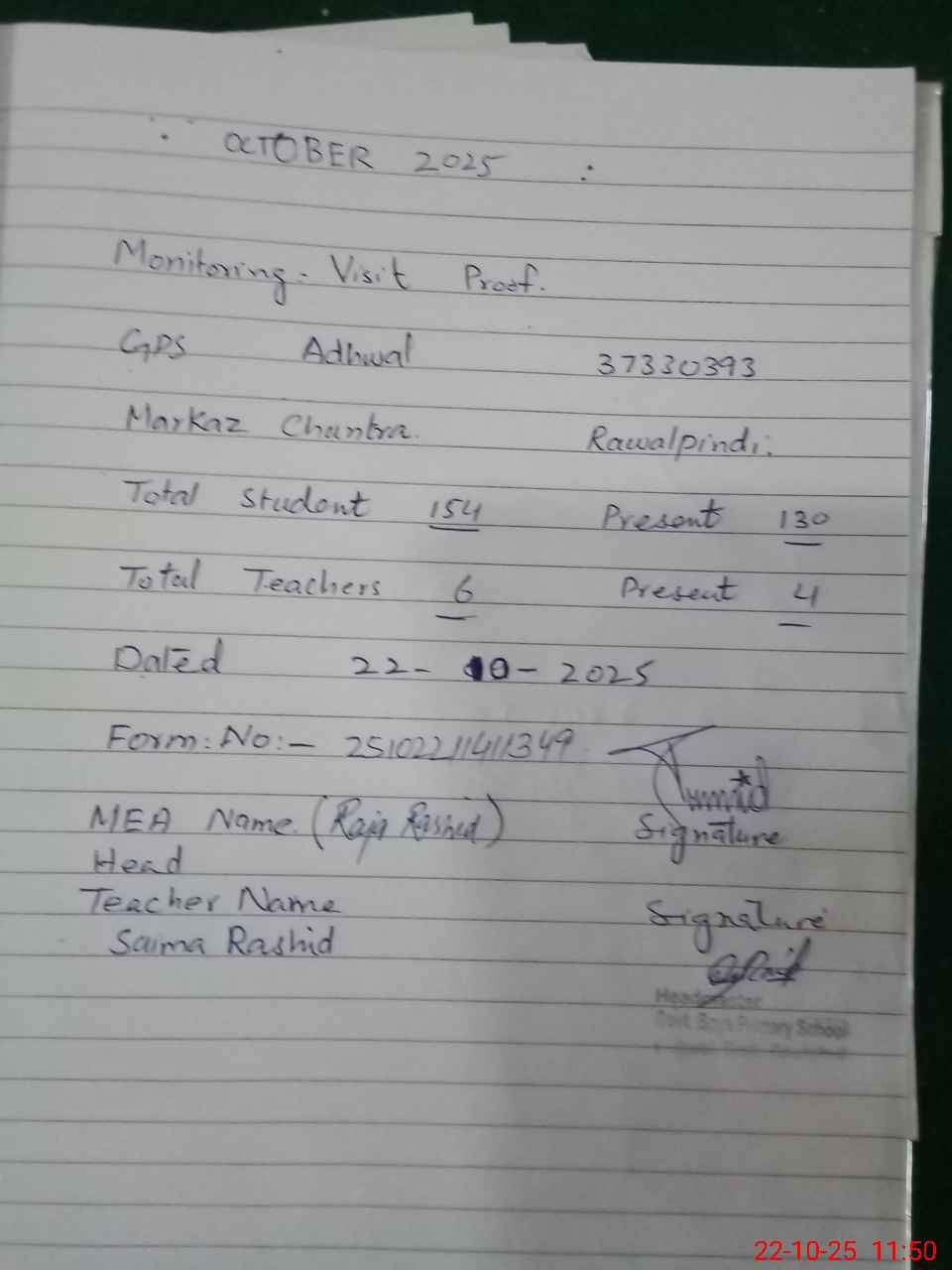 | Attendance Register | Head Teacher | MEA with School | Visit Proof |