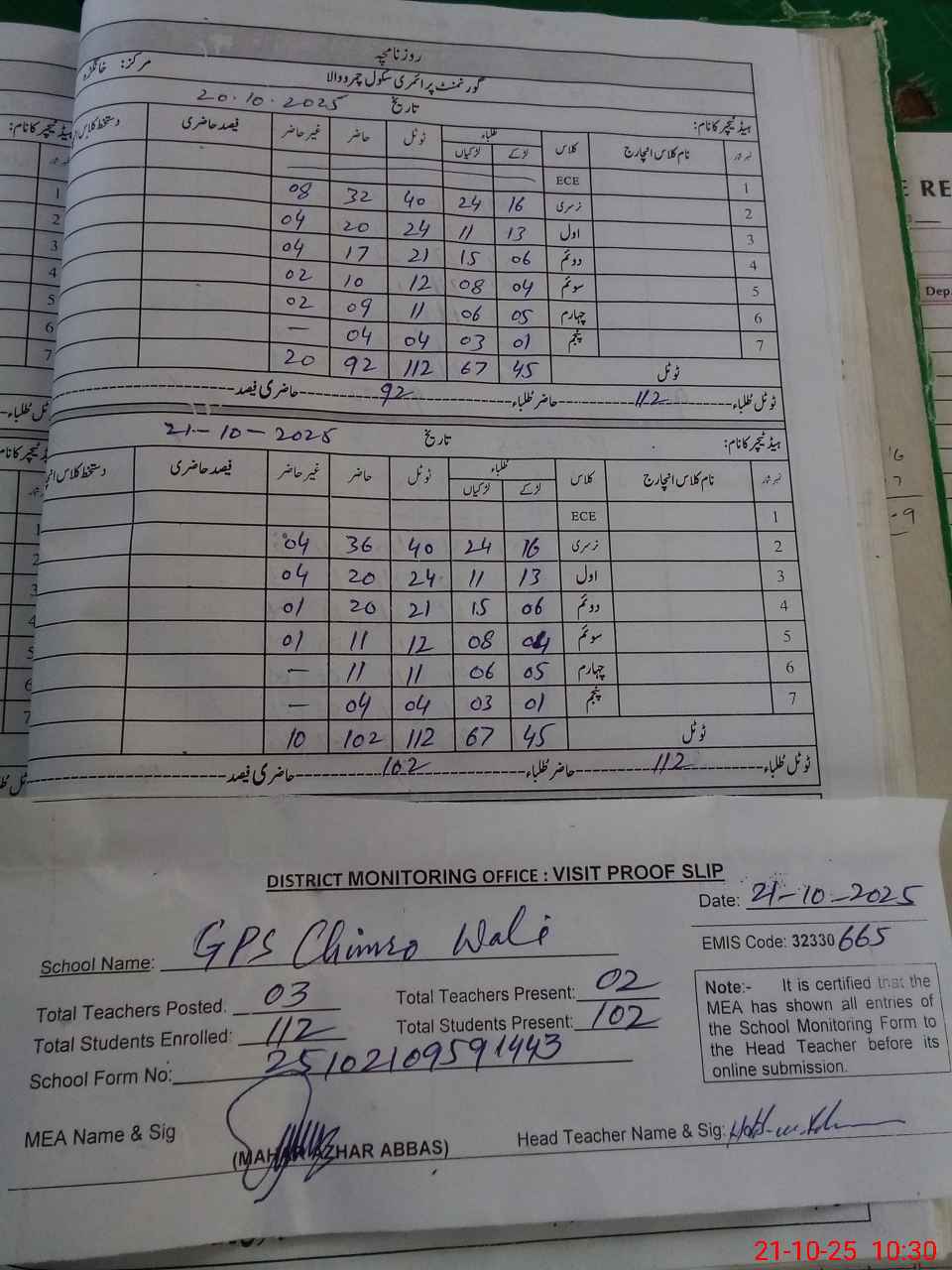 | Attendance Register | Head Teacher | MEA with School | Visit Proof |