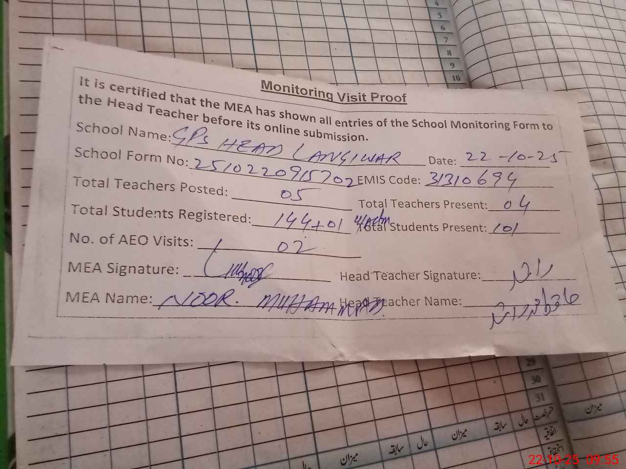 | Attendance Register | Head Teacher | MEA with School | Visit Proof |